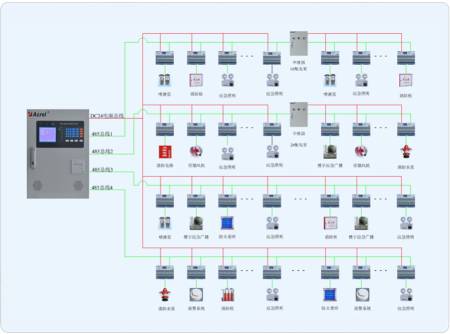 安科瑞電氣于2015年為該項目提供AFPM100小型消防設備電源監控系統解決方案,該系統采用消防設備電源狀態監控器+電壓/電流傳感器的兩層結構組網模式,從而簡化了系統結構設計。系統組網共分為站控管理層、網絡通訊層、現場設備層三層,該項目通訊總線共接入4條通訊總線,總線在樓層配電箱手拉手串接后,接入壁掛式后臺,組成消防設備電源監控系統的大動脈。
