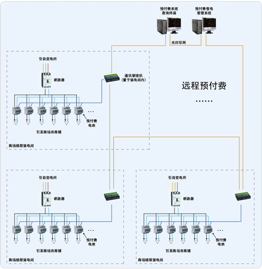 恒通順達廣場需要對商業部分85個商鋪租戶實現預付費:先交費,后用電。為了方便業主充值和物業管理,要求使用遠程預付費方式,租戶在財務繳納電費,財務通過系統直接對儀表進行遠程充值,不需要租戶和物業接觸預付費儀表,既保證人身安全,也保證系統安全。