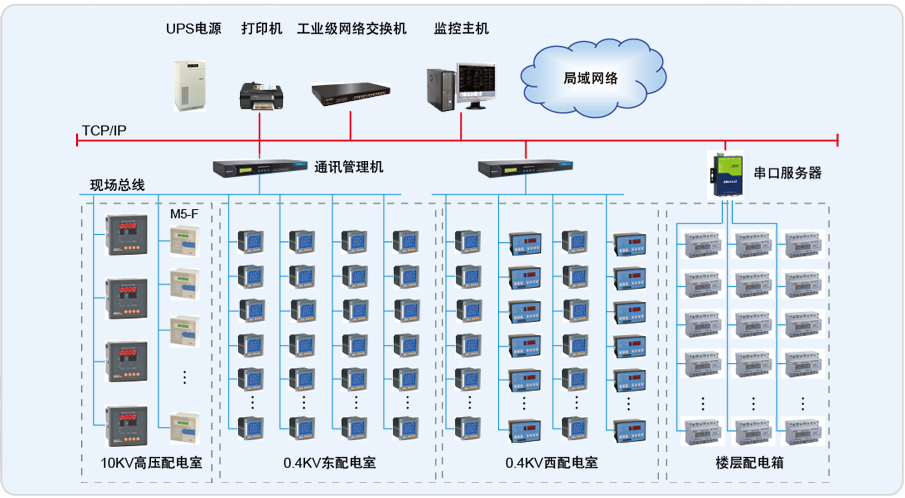 環(huán)智國際大廈配電系統(tǒng)主要包括:一個10KV高壓配電室、2個0.4KV低壓配電室和132個樓層配電箱。10KV配電間主要包括2路10KV進線柜、2個量電柜、2個避雷器柜、4個10/0.4KV變壓器饋線柜。10KV配電間總共使用了8臺M5-F微機保護裝置。0.4KV總進線部分選用ACR330ELH網(wǎng)絡(luò)電力儀表,0.4KV的饋線回路選用了ACR220ELF網(wǎng)絡(luò)電力儀表。電力監(jiān)控系統(tǒng)需要通過T1-T4變壓器溫度控制箱的RS485接口采集變壓器繞組超溫報警信號、鐵芯超溫報警信號以及傳感器故障信號,并要具有聲音報警功能。需要采集直流柜的電池充放電狀態(tài)、電池組電壓、電池組電流、電池房溫度等信號,并通過直流屏信息表在界面上顯示出來。