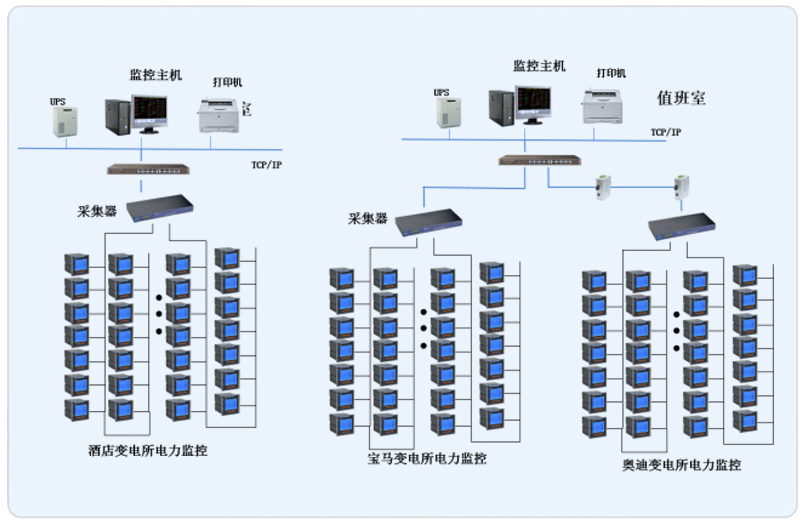 本項(xiàng)目根據(jù)管理區(qū)域設(shè)置兩套Acrel-2000型電力監(jiān)控系統(tǒng),系統(tǒng)采用網(wǎng)絡(luò)分布式結(jié)構(gòu),其中寶馬奧迪主機(jī)設(shè)置在地下配電值班室,酒店設(shè)置在一樓值班室。所有配電回路均配備安科瑞電力儀表PZ系列。該項(xiàng)目實(shí)現(xiàn)了3個變電所內(nèi)電力系統(tǒng)的智能管理。所有監(jiān)控設(shè)備均通過屏蔽雙絞線至各自配電室內(nèi)的通訊管理機(jī),從而實(shí)現(xiàn)遠(yuǎn)程監(jiān)控。