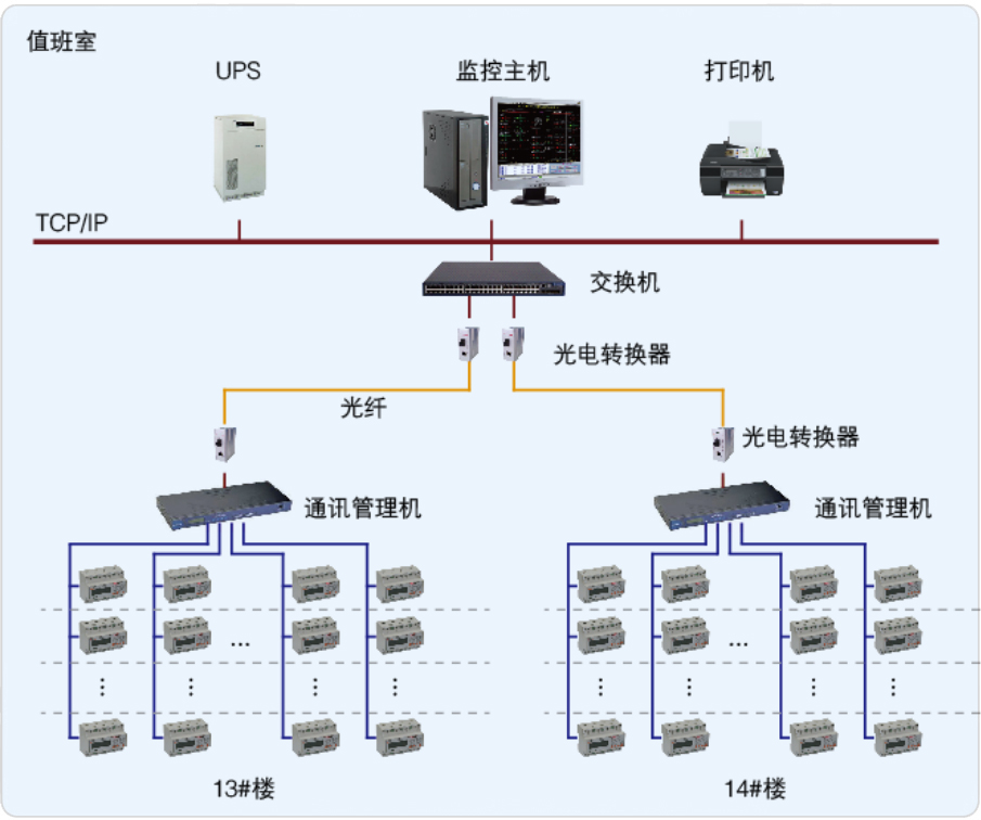 該項目有兩棟樓,均為六層,一共有532個房間,其中13#棟彝學院289個房間,14#棟藏學院243個房間,采用我司ADF100單相多用戶電能表195個,分為24條RS485總線接至通訊管理機,通訊管理機通過光纖拉至值班室連接到Acrel-3000預付費電能管理系統(tǒng)后臺,實現總線上儀表與監(jiān)控主機的數據連通。該系統(tǒng)為學校宿舍項目解決用電問題提供了真實可靠的依據,取得了較好的管理水平。