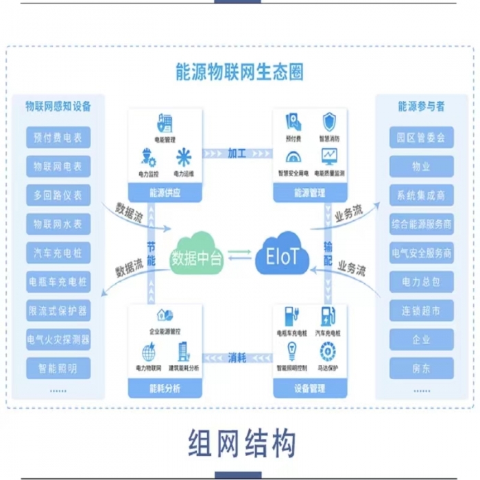 ● 感知層:連接于網絡中的各類傳感器,包括多功能儀表、預付費電表、多回路儀表、物聯網電表、物聯網水表、電瓶車充電樁、汽車充電樁、路燈控制器等。