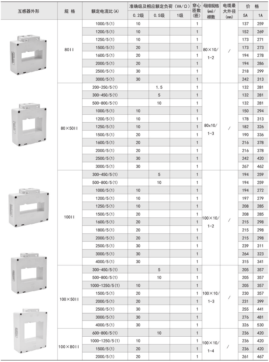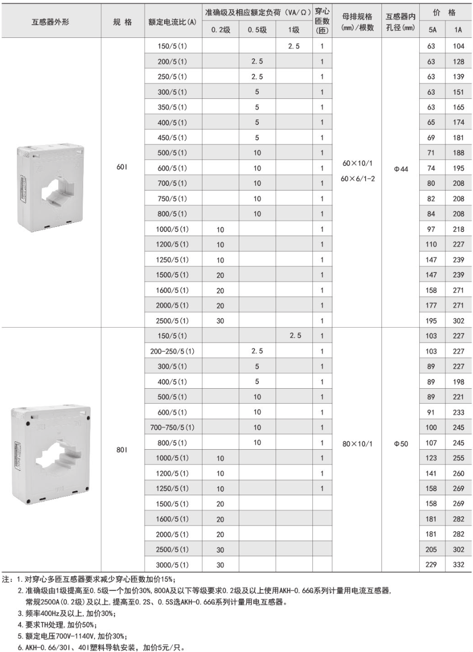 該系列互感器作為交流電流信號(hào)采集元件,可與測(cè)量?jī)x表配套使用,一次電流測(cè)量范圍5-6300A,二次輸出5A或1A,測(cè)量范圍為額定值的5-120%。低壓配電系統(tǒng)電流采集具體型號(hào):AKH-0.66/I 30...