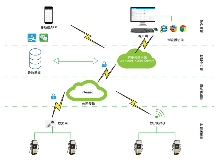 充電樁可選配WIFI模塊或GPRS模塊接入互聯(lián)網(wǎng),配合加密技術(shù)和秘鑰分發(fā)技術(shù),基于TCP/IP的數(shù)據(jù)交互協(xié)議,與云端進(jìn)行直連。云平臺(tái)包含了充電收費(fèi)和充電樁運(yùn)營的所有功能,包括財(cái)務(wù)管理、變壓器監(jiān)控和運(yùn)營分析等功能。